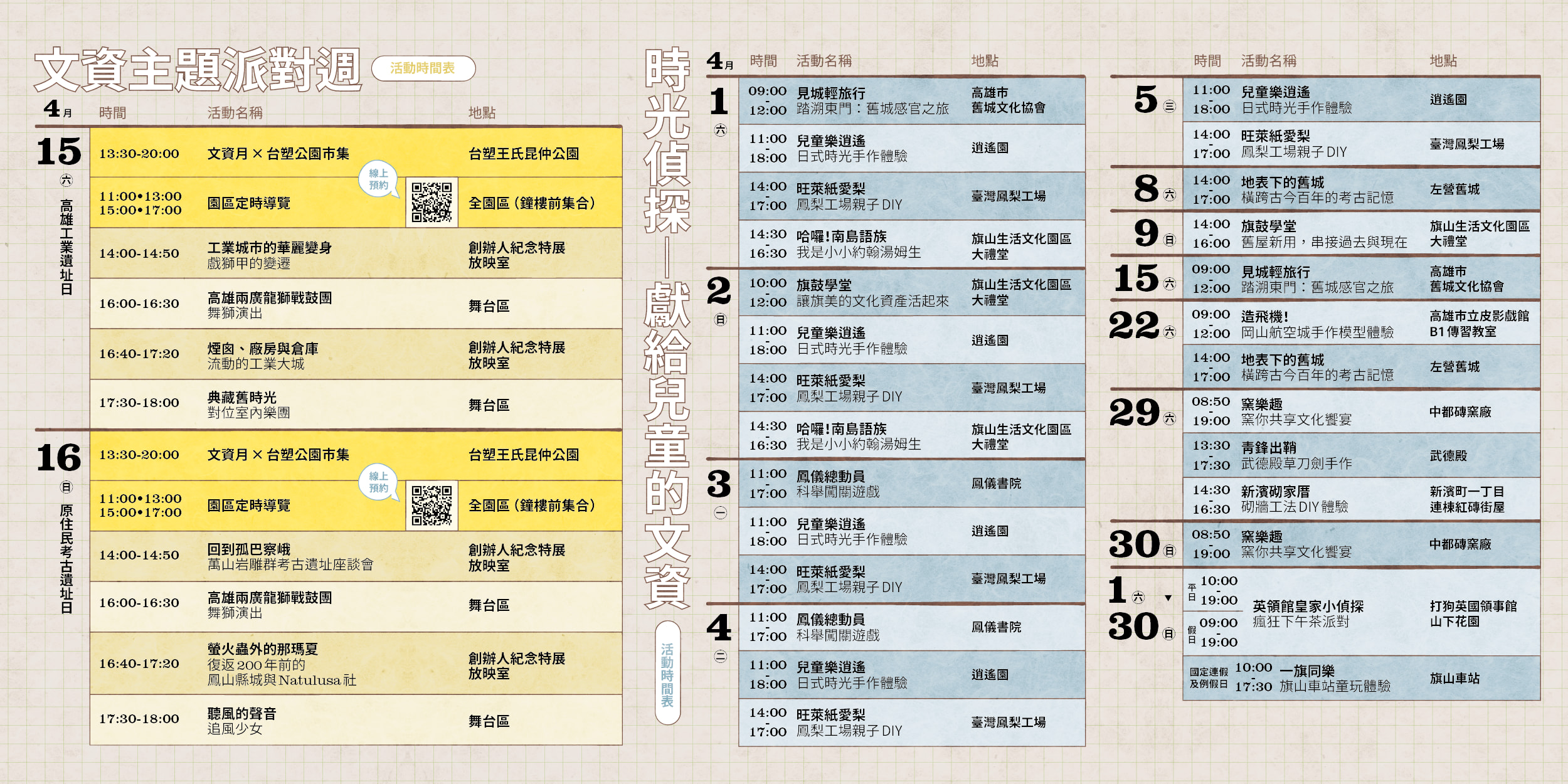 4月18日是一年一度的國際古蹟遺址日,高雄擁有豐富的文化資產,高雄市文化局盛大推出2023文資月系列活動,於4月起在各大文資景點隆重登場。繼去年的文資週在中都磚窯廠的活動大獲好評後,今年文化局除了串聯11個文資場館遍及8個行政區,更特別邀請於今年1月首度開箱且深受民眾喜愛,有著台塑企業起家厝之名的台塑王氏昆仲公園一起擴大辦理文資月活動。配合兒童節策畫「時光偵探-獻給兒童的文資」主題,從考古遺址、原住民文化、古蹟建築、產業發展等面向,邀請大家帶著孩子到高雄文化資產場館踏青,春日漫遊高雄舊時光,用童趣的方式體驗屬於高雄歷史文化的過往與文化資產保存的重要性。