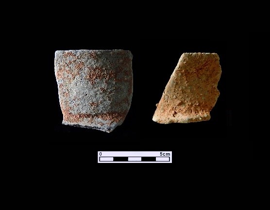 以紅褐素面夾砂陶為主,並有彩陶、黑陶、磨光黑陶,該文化陶器在質地上有「砂化」的特色,並摻有明顯的板岩,可能於高屏溪沿岸取土,採土範圍擴大。從質地上區分成 3 種,第一類泥質陶、第二類夾細砂陶、第三類夾粗砂陶:第一類泥質陶:胎土相當細緻。第二類夾細砂陶:摻和料顆粒大小粒徑小於 2mm 以下之細砂為主,有角礫狀顆粒摻雜,陶片器表可見顆粒剝落的坑洞。第三類夾粗砂陶:摻和料主要為沉積岩或變質岩,而顆粒多數大於 3mm,可見角礫狀的岩屑顆粒摻雜,淘選度相當差,顆粒分布密度不均。罐形器唇部呈現尖圓唇或圓唇,頸折內部形式為弧轉。