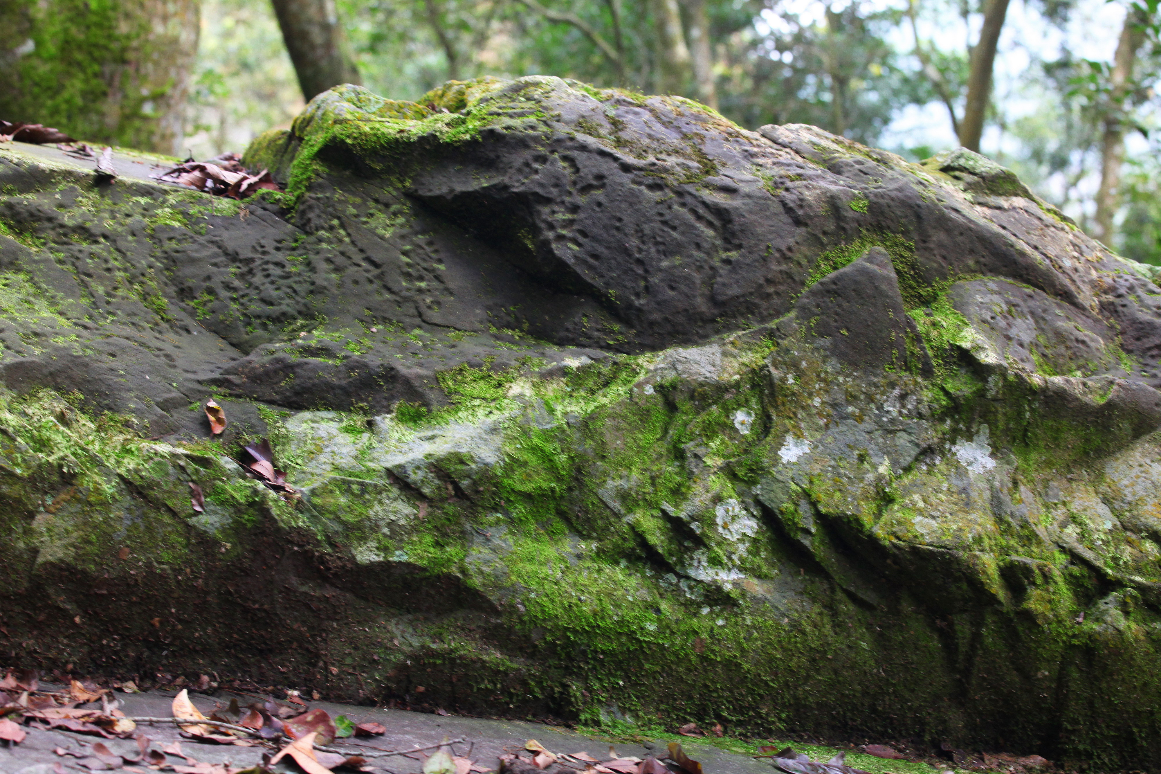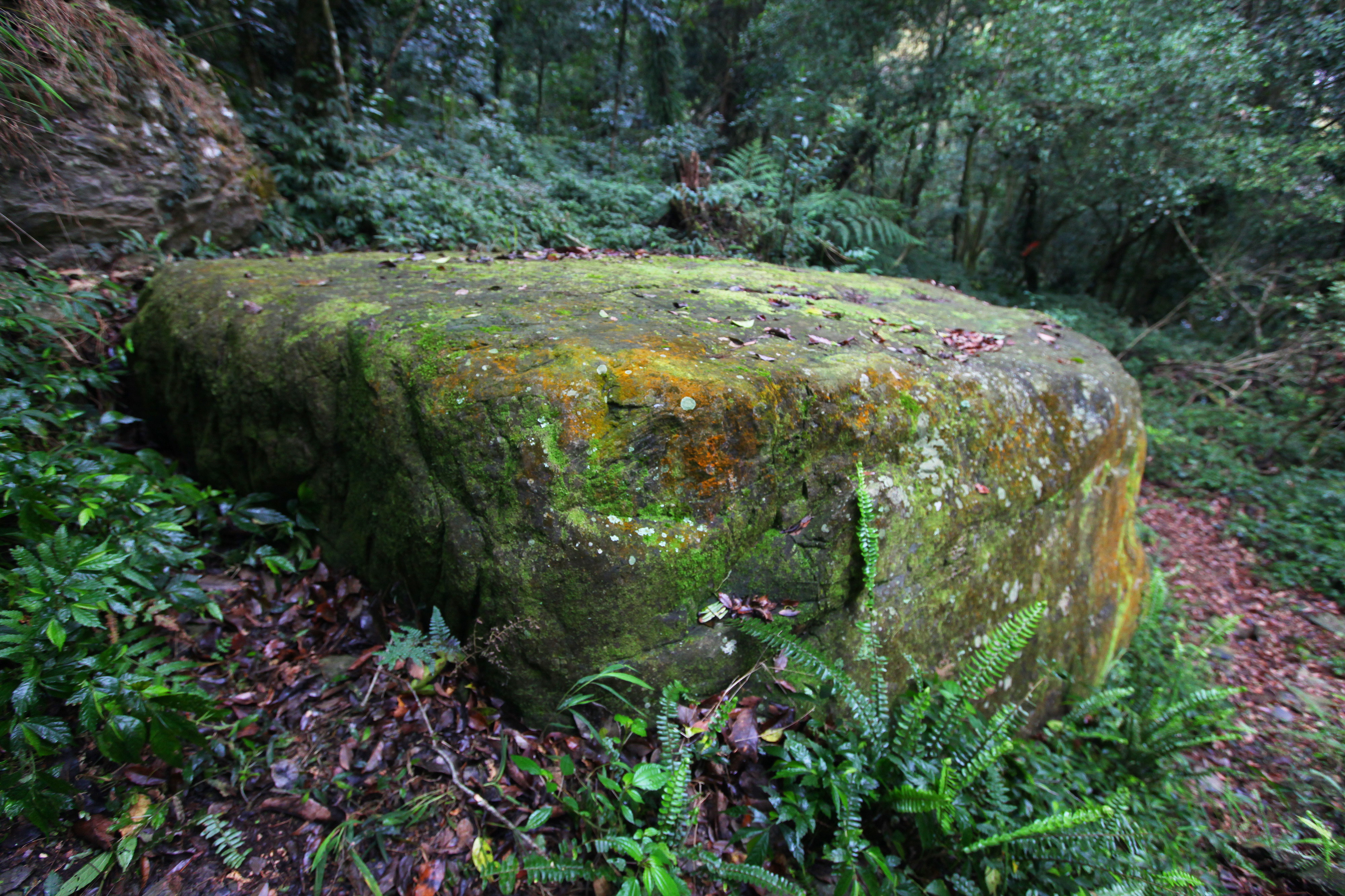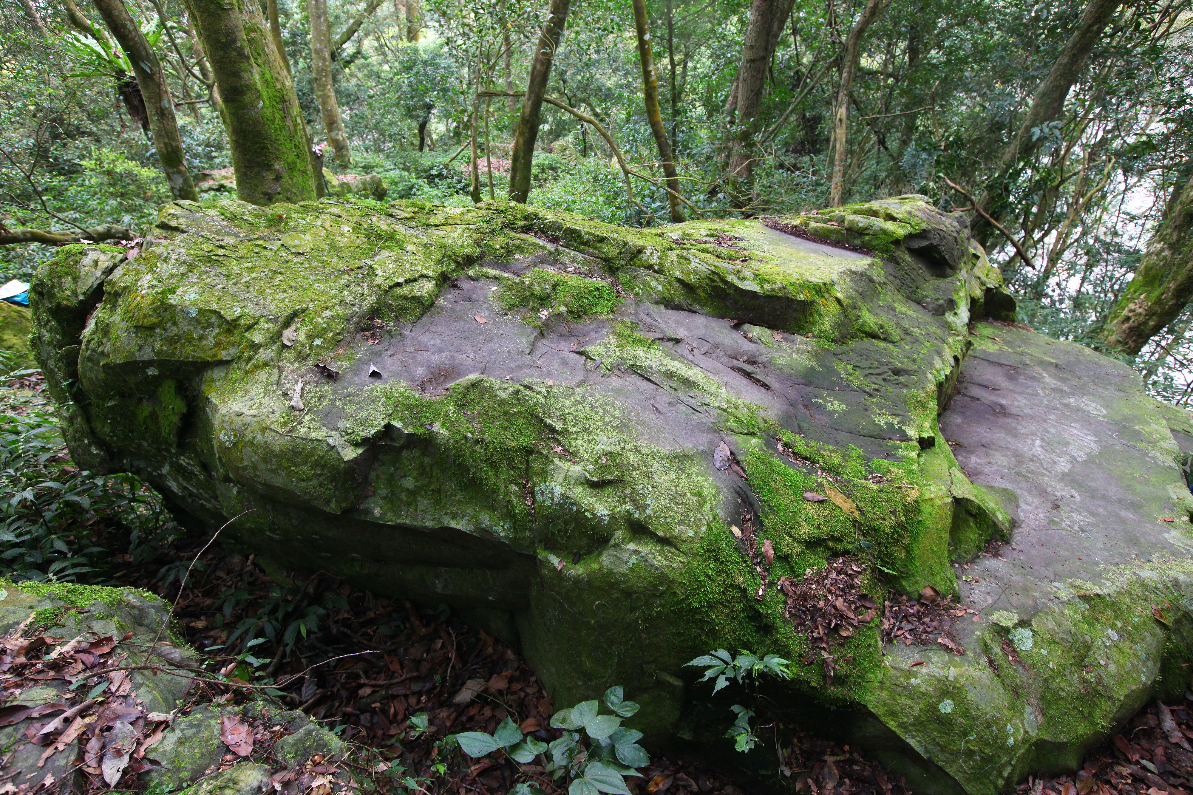 岩石體積小又位在陡峭的山脊上探勘困難。岩石表面及週邊均已遭樹根、殘枝落葉、青苔覆蓋,難以辨識,必須清除後才能辨識。此岩雕正面前兩公尺即為約70度的陡坡,岩石表面似有曾剝落斷裂的痕跡,懷疑曾因地震而受損。岩雕西側平坦地有一半月型石板屋遺址。