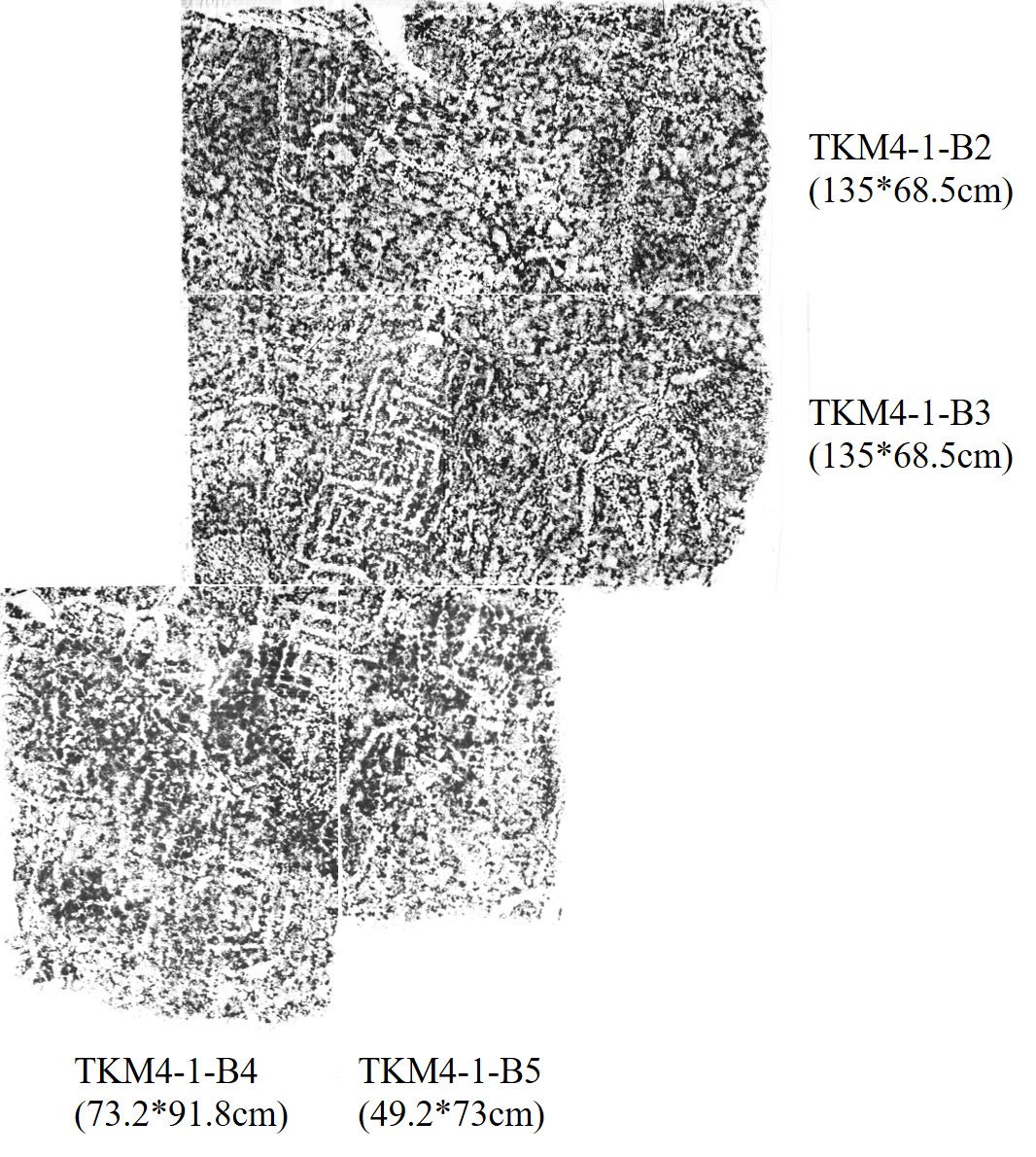 國定萬山岩雕群考古遺址在歷年的探勘與巡查工作中,已進行多次的拓片工作,這些拓印活動主要集中在1984~2012年間,目前由高雄市政府文化局保留的拓片資料中,因孤巴察峨地點岩體表面大抵呈平面塊狀,因此岩雕刻紋數量最多、分布範圍最大,曾進行拓印的次數也最多,援引高業榮針對圖像的分區以A~G等七個編號分區(高業榮 1991:122),含合併與重複之拓片,總計保留18件;祖布里里地點則僅進行其中TKM2-1岩雕的拓印,總計保留4件拓片;莎娜奇勒娥地點則保留有4件拓片;至於大軋拉烏地點則僅進行其中TKM4-1、TKM4-5、TKM4-7的拓印工作,總計保留8件拓片資料,另有拓片資料仍散落於當時執行委託計畫或進行拓片工作的公私立大學、博物館、萬山社區發展協會、甚至私人手中,保存狀況則不詳。